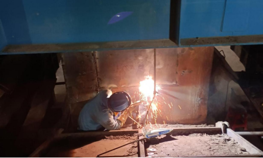 在假期的生产现场,此起彼伏的烧焊声吱吱作响,伴着闪烁的弧光,黄红色的焊花如喷泉般涌现飞溅。蓝色的工装伴着阵阵焊接机械轰鸣,构成了一曲献给祖国母亲的最美奋斗乐章。