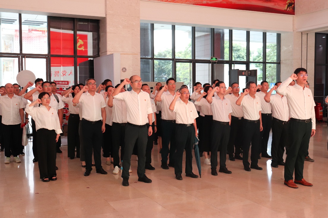 参观学习后,全体党员在党委副书记、总经理成苏宁同志带领下,举起右拳,面向党旗庄严重温入党誓词,铿锵誓言回荡展厅,重燃同志们不忘初心、永葆本色的坚定信念。