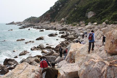 深圳东西冲海岸线是深圳最美丽、最经典的海岸徒步线路,被《国家地理杂志》评为中国最美的十大徒步线路之一。此次活动我们选择的路线是从东往西沿海岸线穿越,历经岛屿、礁石、海蚀岩、峭壁等不同海积海蚀地貌,大部分路段都不是能正常行走的道路,很多时候需要手脚并用才能前进,而且途中没有任何交通工具可以借助。穿越过程中,大家结伴前行,充分发扬团队协作精神,互帮互助,克服了恐惧、骄阳、饥饿、口渴、疲惫、抽筋甚至伤痛等困难,历经4个多小时终于到达目的地。